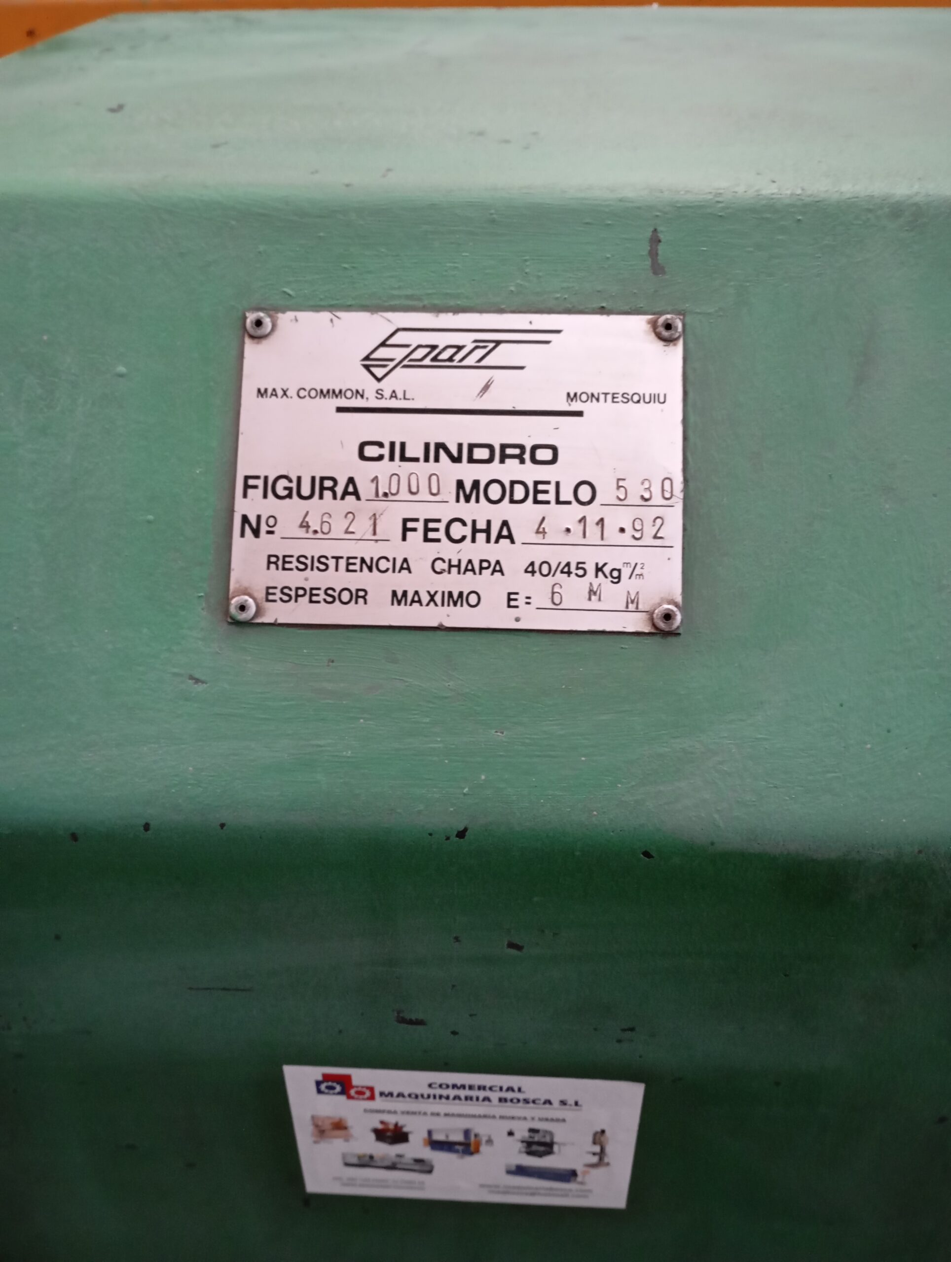 Cilindro curvador marca EPART mod. 1000X6 Anchura de curvado: 1000mm Espesor de curvado: 6mm Diametro rodillo superior: 135mm Diametro rodillos inferiores: 125mm Con pedal de accionamiento.