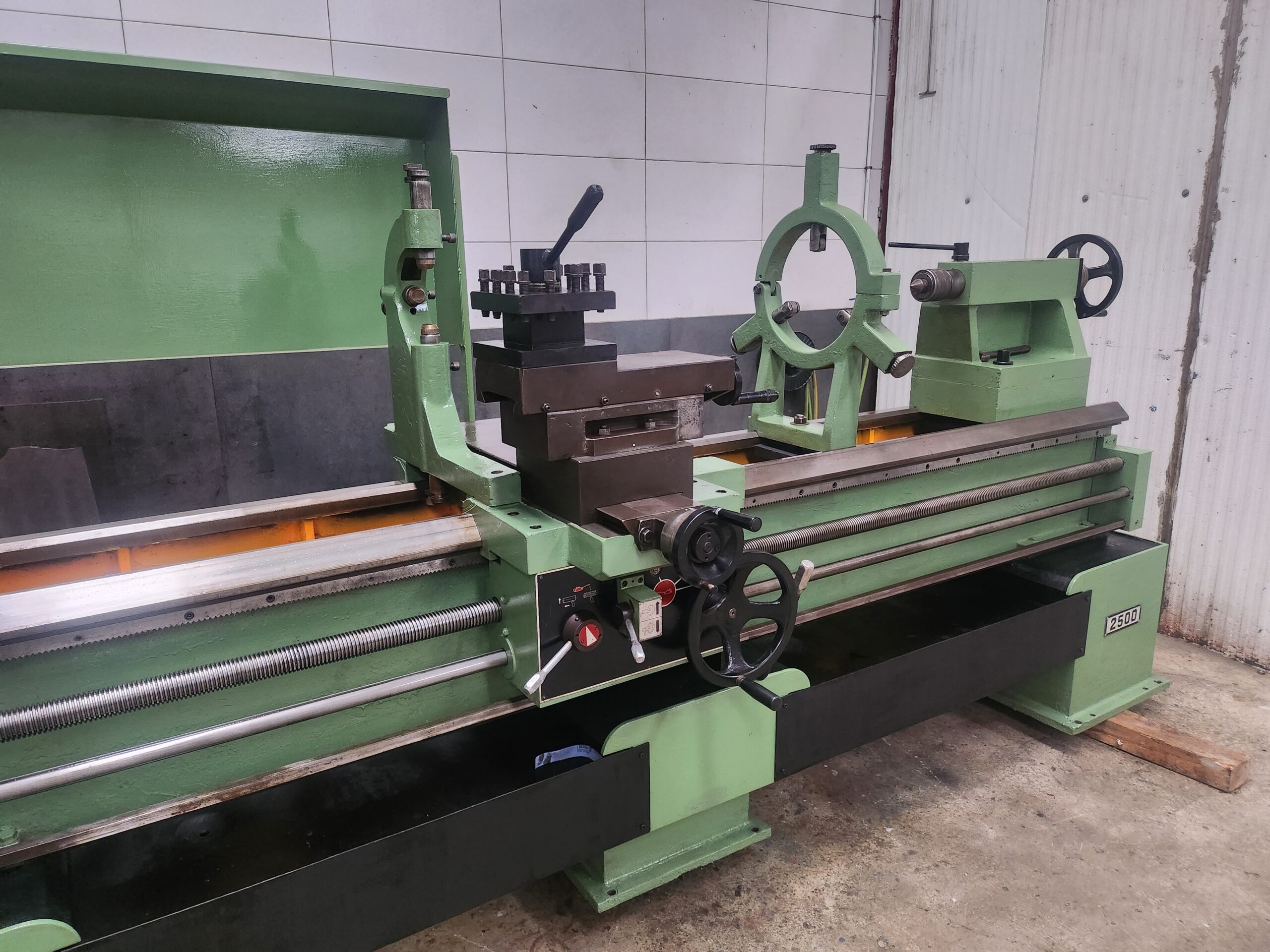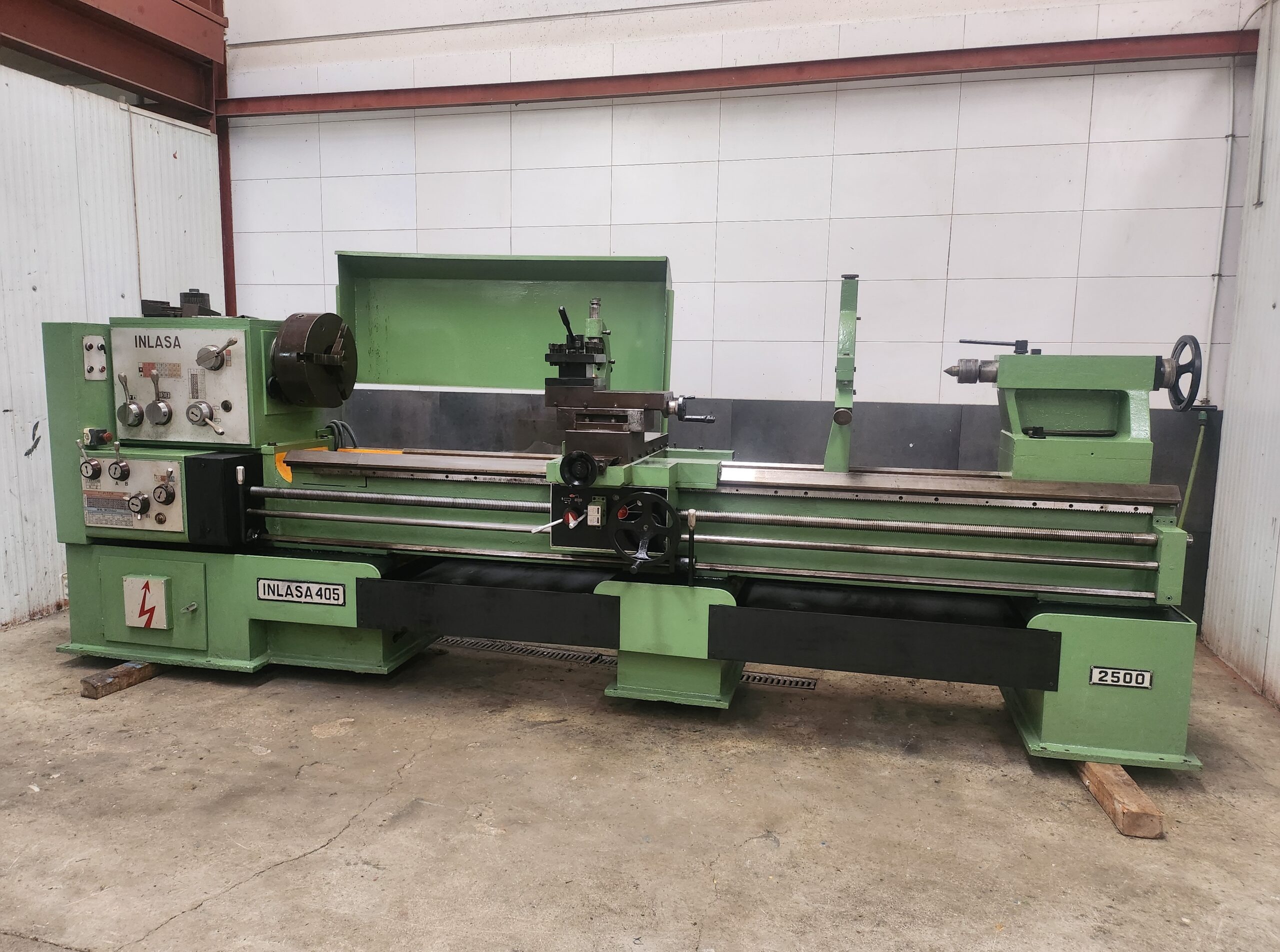 Torno paralelo marca INLASA mod. 405 Distancia entre puntos: 2.500mm Volteo sobre bancada: 810mm Agujero de la caña: 80mm Plato de 3 garras autocentrante de 400mm de diametro. Equipado con luneta fija y luneta movil y juego de piñones para roscar.