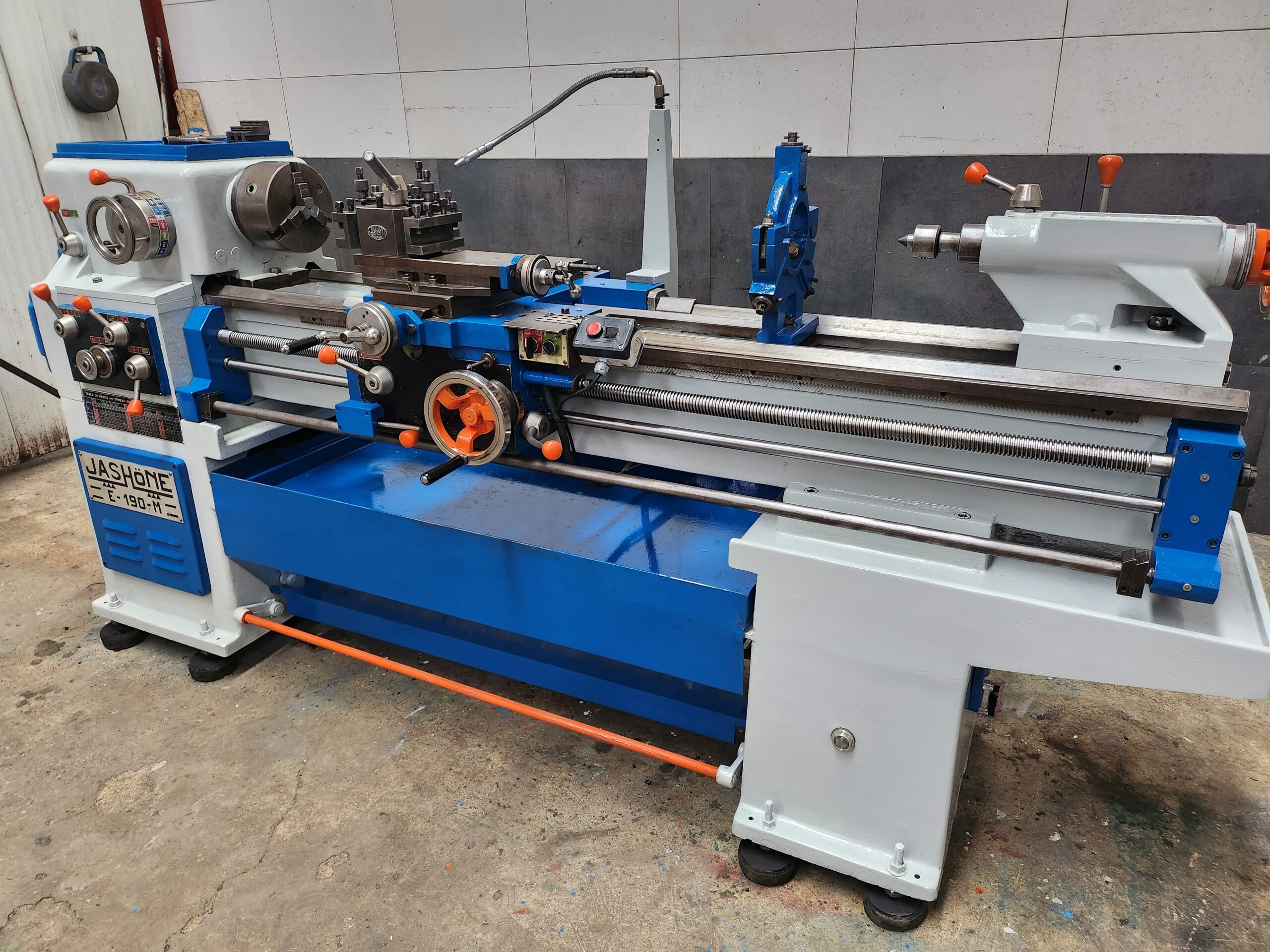 Torno paralelo marca JASHONE mod. E-190-M Volteo sobre bancada: 380mm Distancia entre puntos: 1.600mm Agujero de la caña: 52mm Equipado con torreta de cambio rapido, freno de pedal, bomba de taladrina y luneta fija.